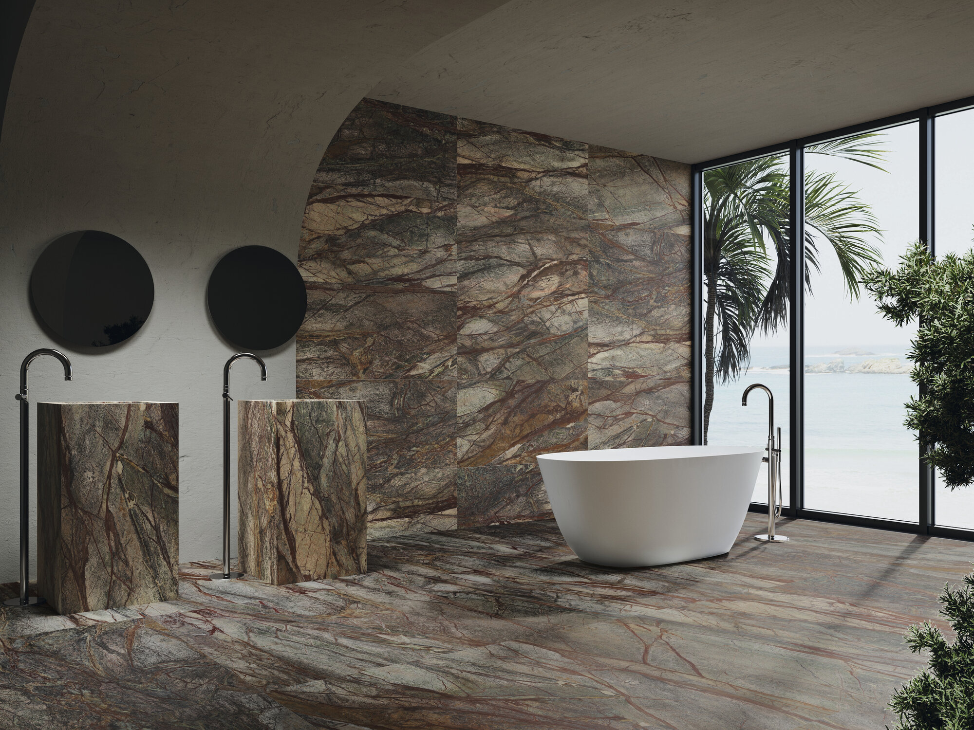 The calm that envelops forests and the stillness of natural landscapes comes into the home with Forest Green, capturing the essence of natural marble. Its deep tones, crossed by white veins and warm nuances, recreate the vitality and exotic strength of nature. Forest Green combines large format and advanced technology to provide functionality and aesthetics. Its polished finish enhances chromatic depth, while its matte texture emphasizes authenticity. This collection invites nature into interior spaces, bringing freshness, character, and a unique natural presence.