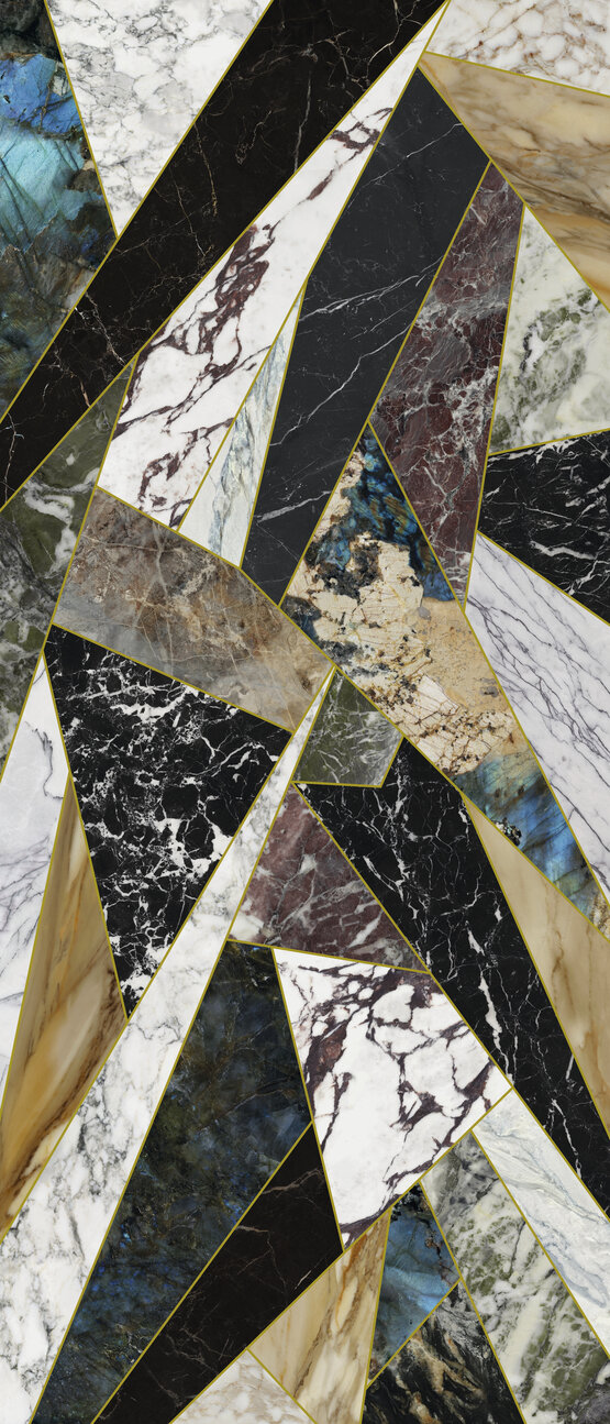Astratto is a masterpiece in large format, where marble is reinvented through a striking collage. Fragments of various natural stones intertwine in a symphony of colours and textures, with deep veins and golden reflections that evoke luxury and sophistication.