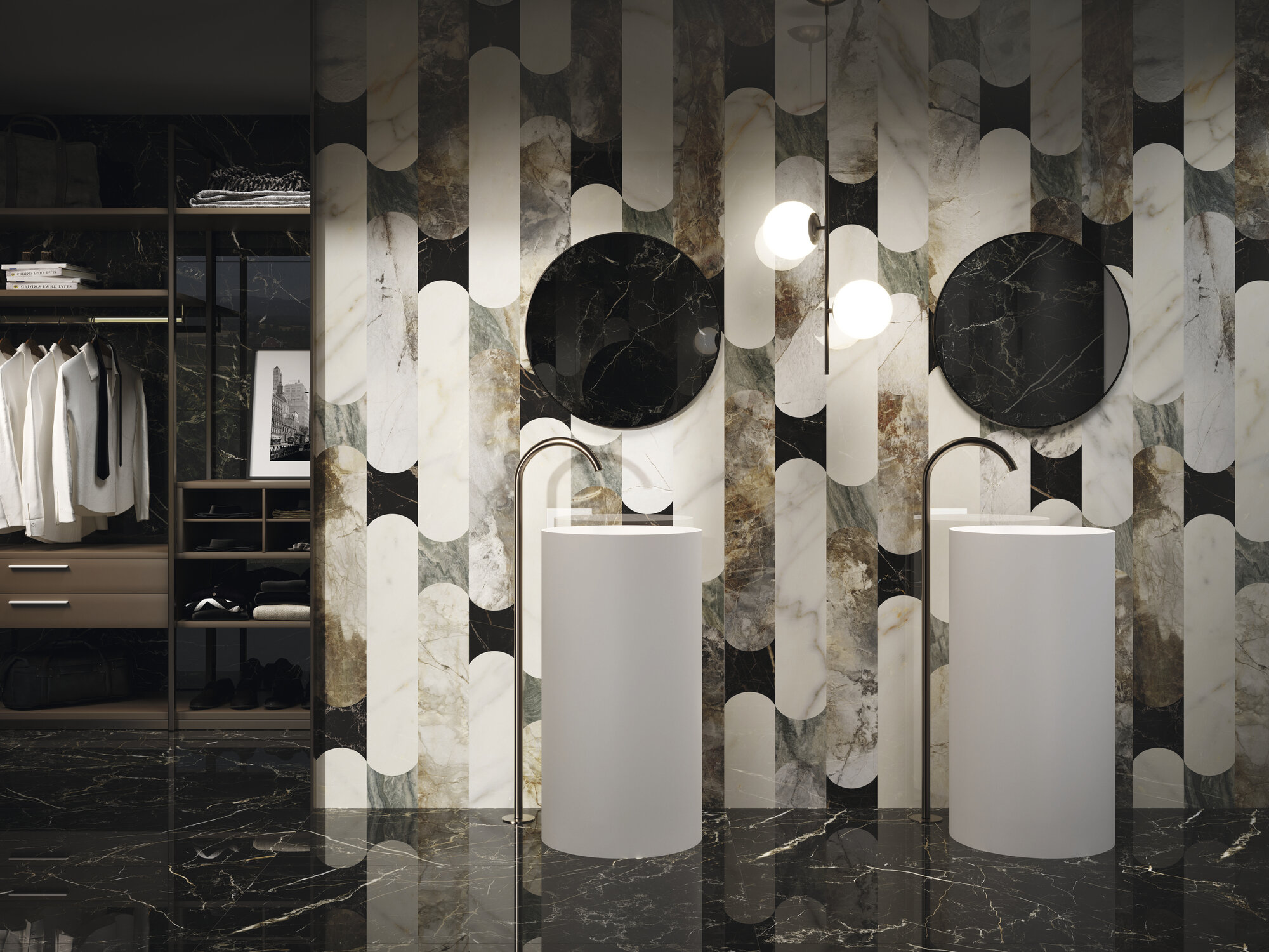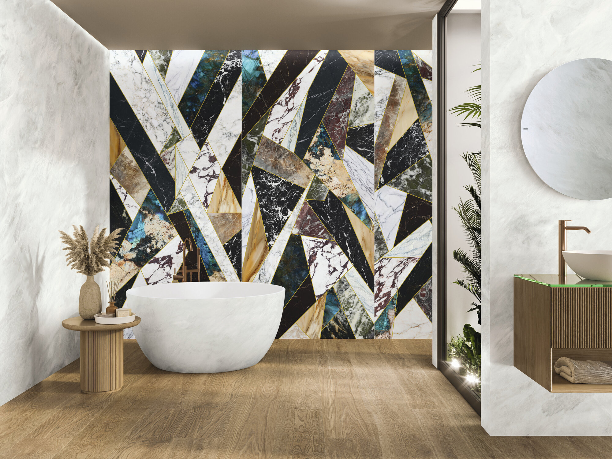 Meanwhile, Capsule reinterprets the elegance of marble through a fluid, immersive geometric design. Its elongated, organic shapes create a mesmerising visual rhythm, where the interplay of natural stones enhances both light and texture.