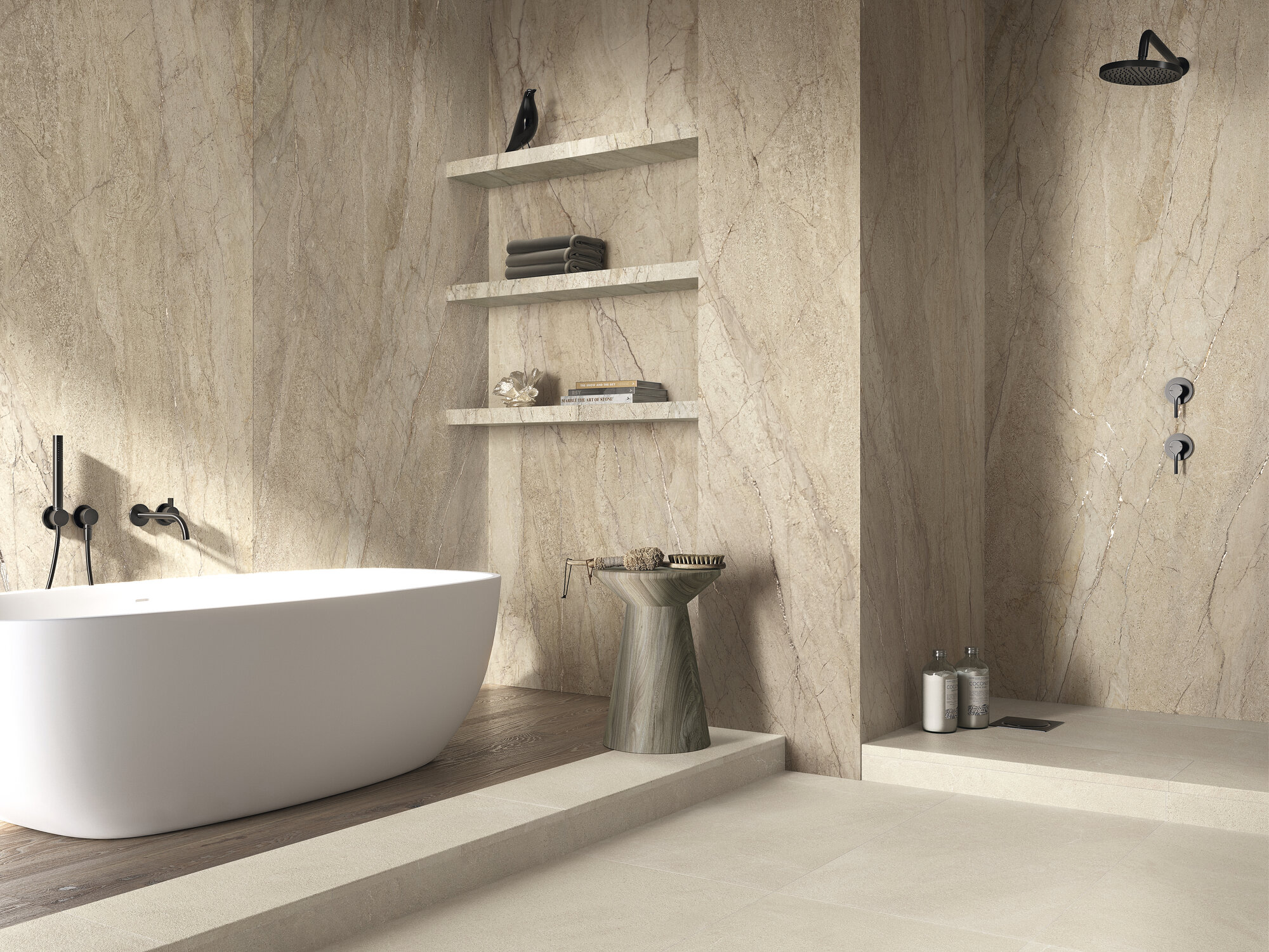 Imperial and glorious marbles, exceptionally worked pieces to recreate sober environments capable of going through all the corners of our home. Daino Real, precious natural marble, extracted from Sardegna, characterized by a warm and timeless cream color, serves as a background to fuse the most characteristic veins of a powerful Essential Grey. After delicate work in its matte version, light can be seen reflected, achieving a soft contrast that highlights its purest essence through a wide variety of formats and polished and matte finishes.