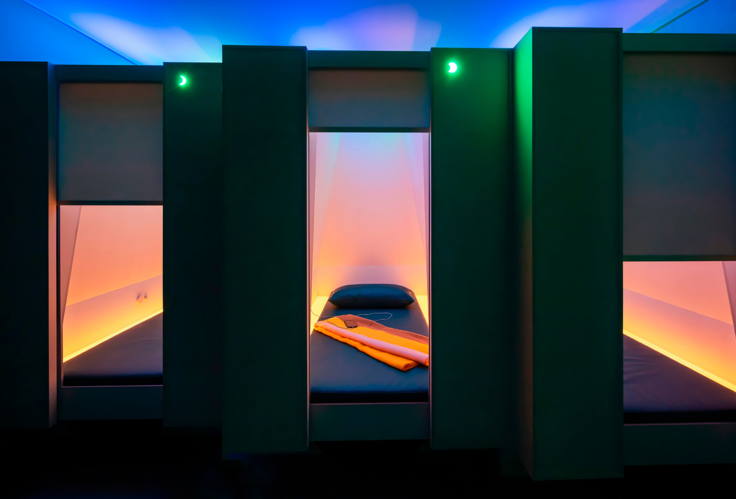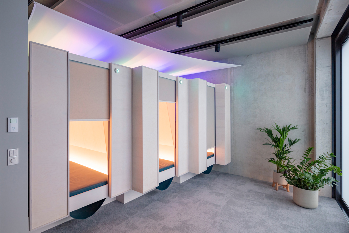 Bureau de Contentful à Berlin. Les employés ont été consultés pour sa conception. Conçu par Toi Toi Toi Creative Studio, il dispose de cabines de sieste conçues sur mesure avec chromothérapie pour se détendre.