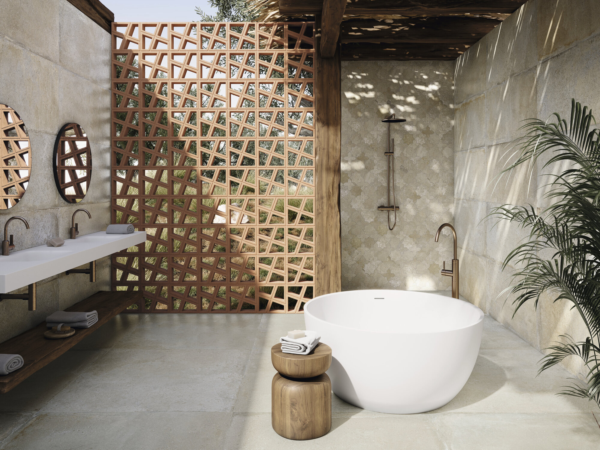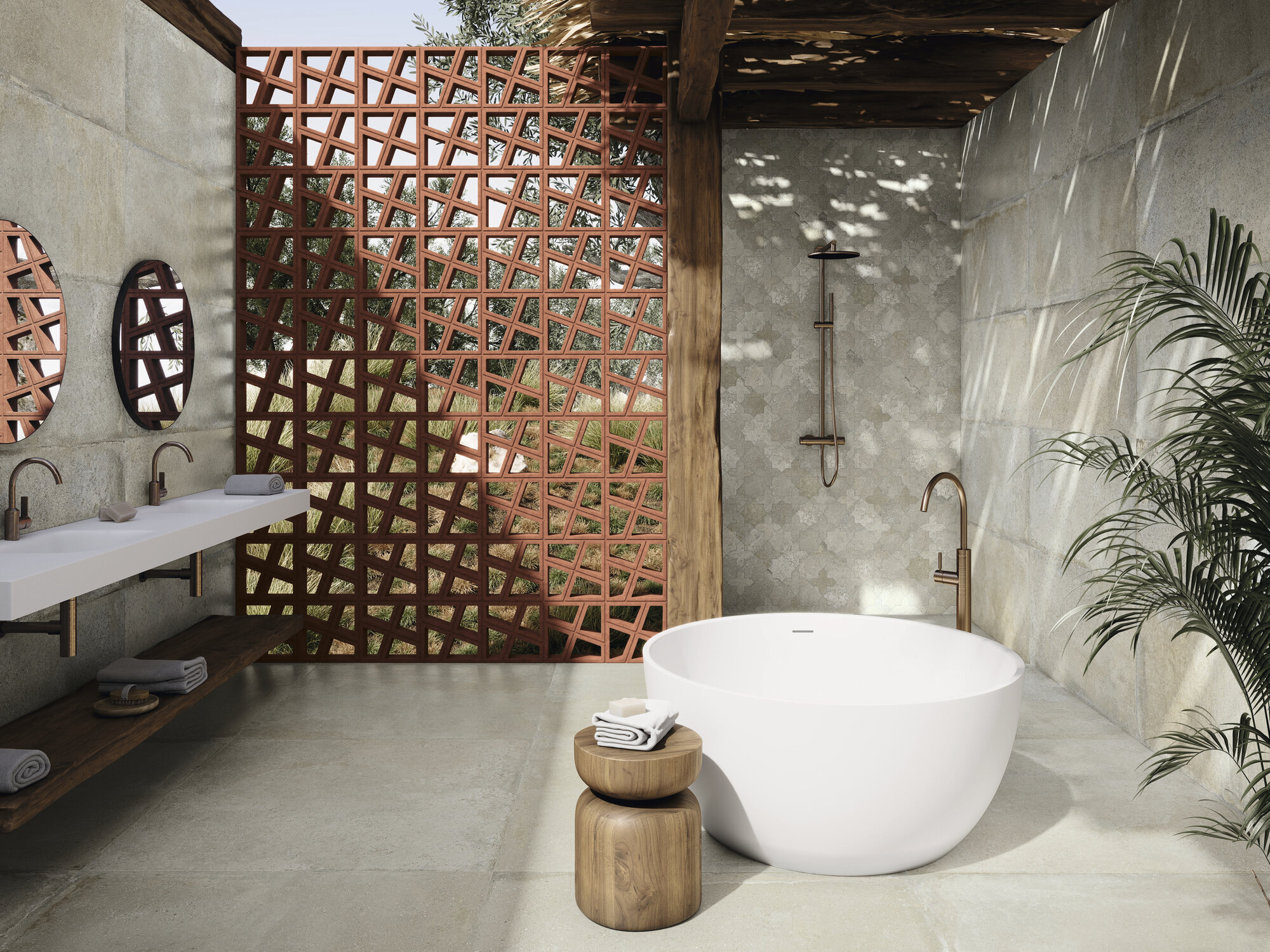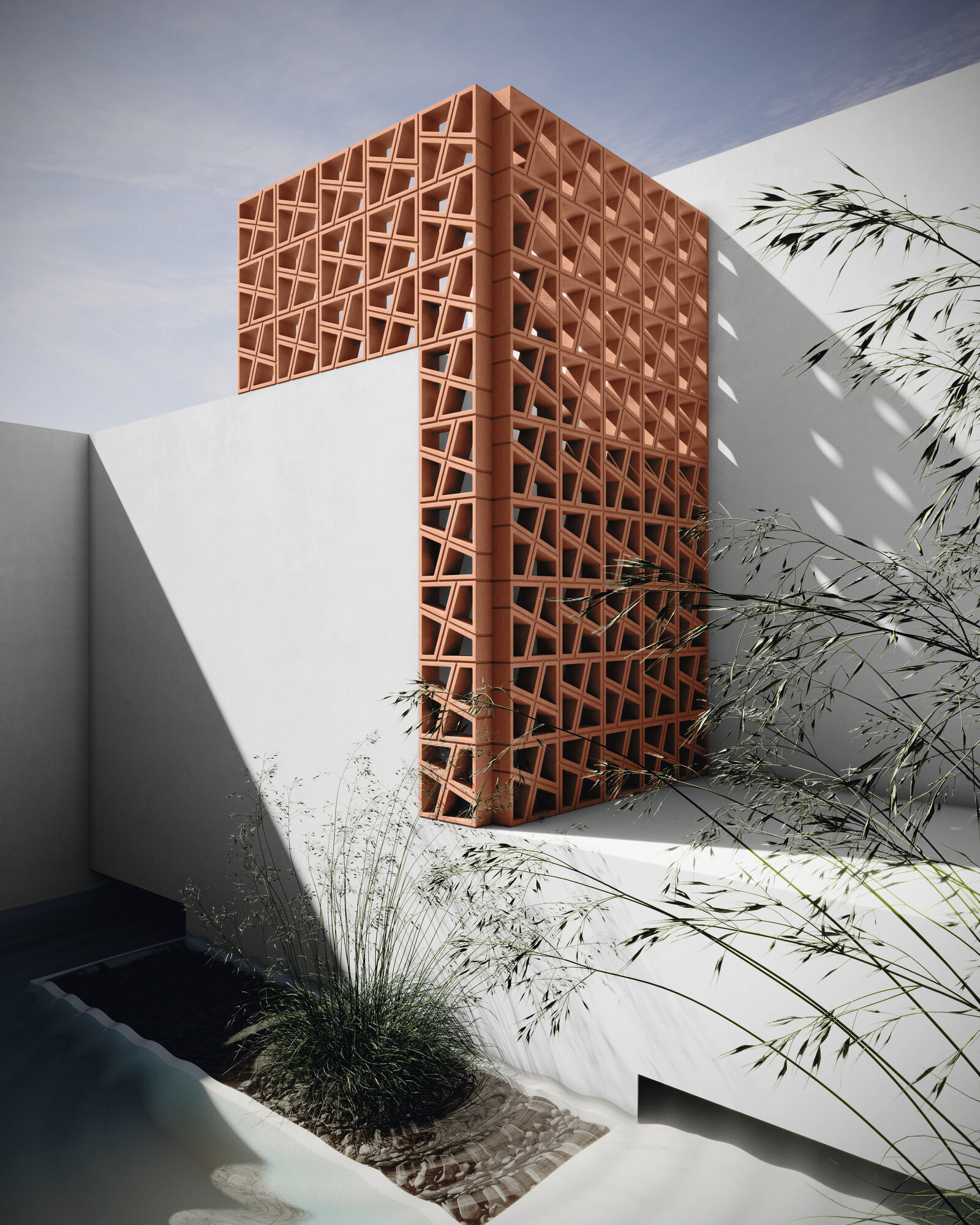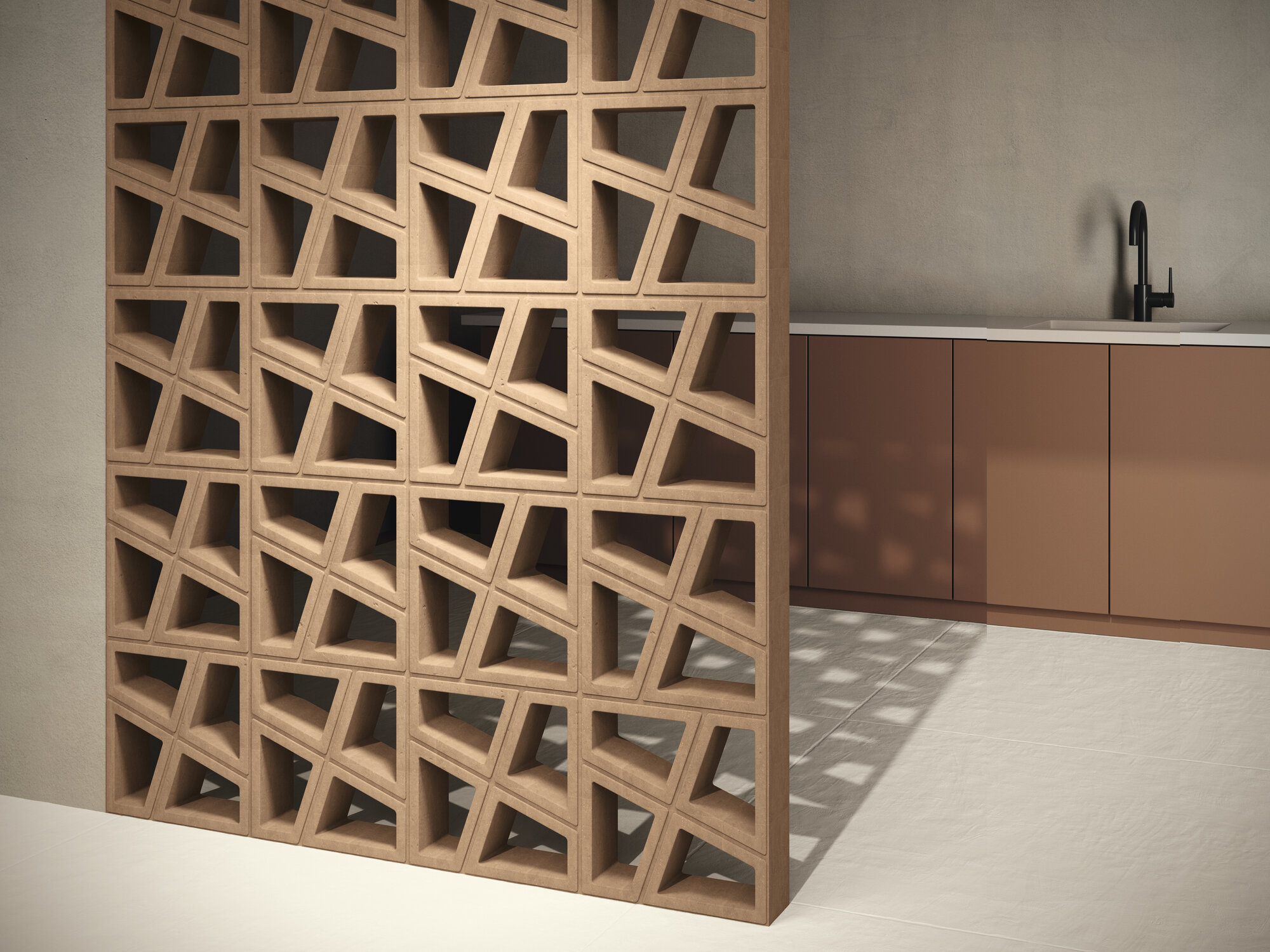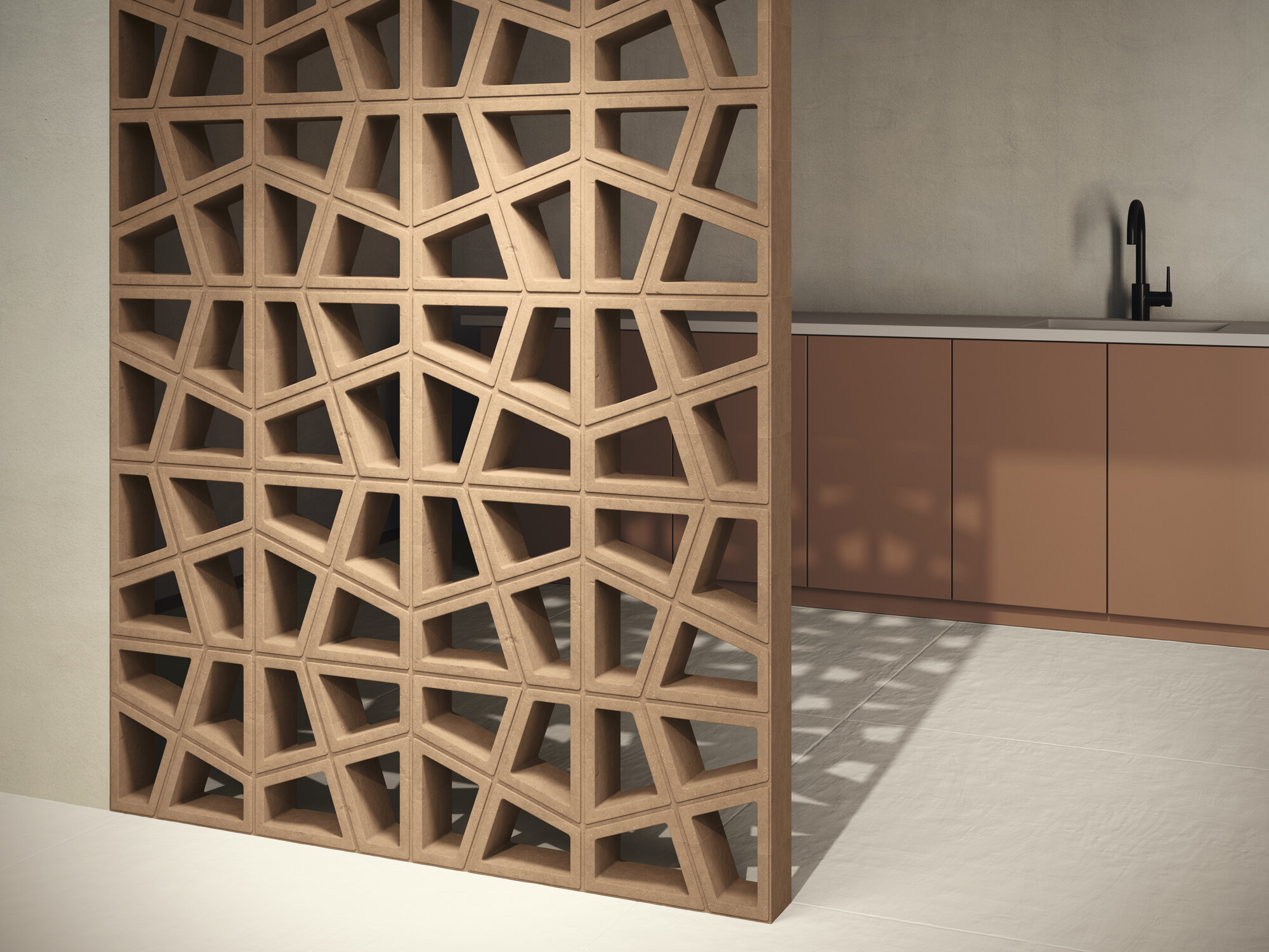 La extrusión de dos tipos de arcillas, trabajadas con extremo cuidado, se combina con una paleta cromática minuciosamente seleccionada para dar paso a una nueva geometría, una celosía donde la rigidez aparente del basalto se transforma en un juego dinámico de volúmenes y colores. Cada pieza de Tetra es una invitación a reconstruir espacios con la misma precisión y belleza con la que la naturaleza esculpe sus paisajes.