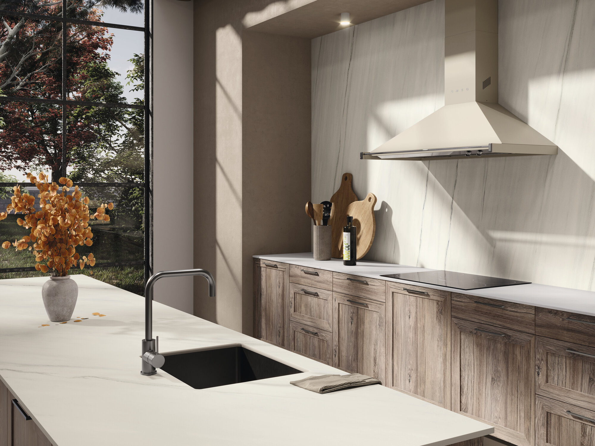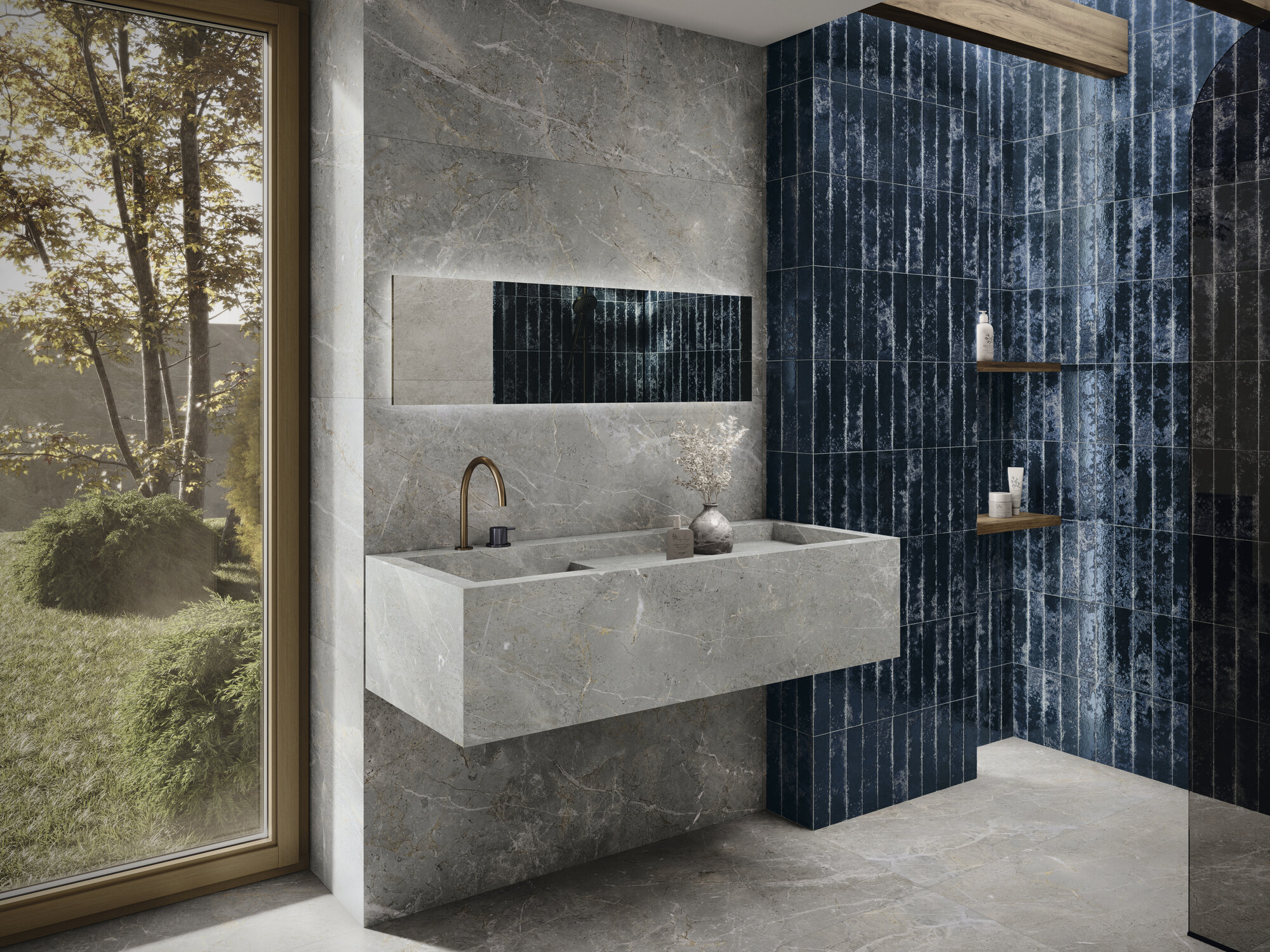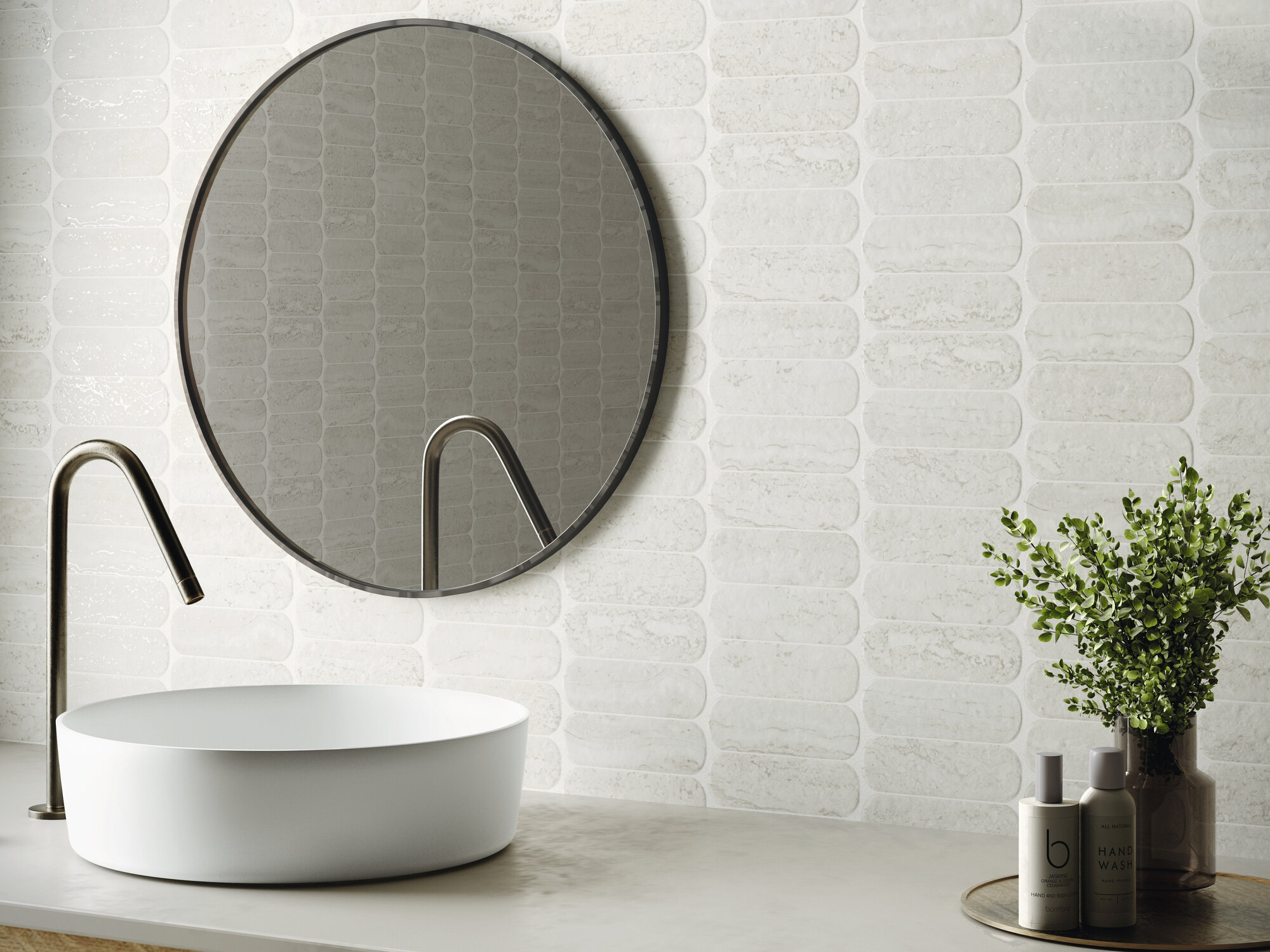 Travento es una colección que reinterpreta el mármol travertino mediante un diseño técnico impecable, combinando la textura característica del corte transversal crosscut con sutiles toques de brillo que realzan la profundidad natural de la pieza. Su formato ovalado, cuidadosamente desarrollado, aporta una dimensión orgánica y fluida, ideal para proyectos arquitectónicos que buscan equilibrar modernidad y sofisticación. Esta geometría se complementa con piezas de forma rectangular, llamada Striata, ofreciendo una versatilidad compositiva excepcional para soluciones de pavimento y revestimiento. Travento destaca por su capacidad de adaptarse a las exigencias técnicas y estéticas de espacios contemporáneos, manteniendo la esencia atemporal del mármol travertino.