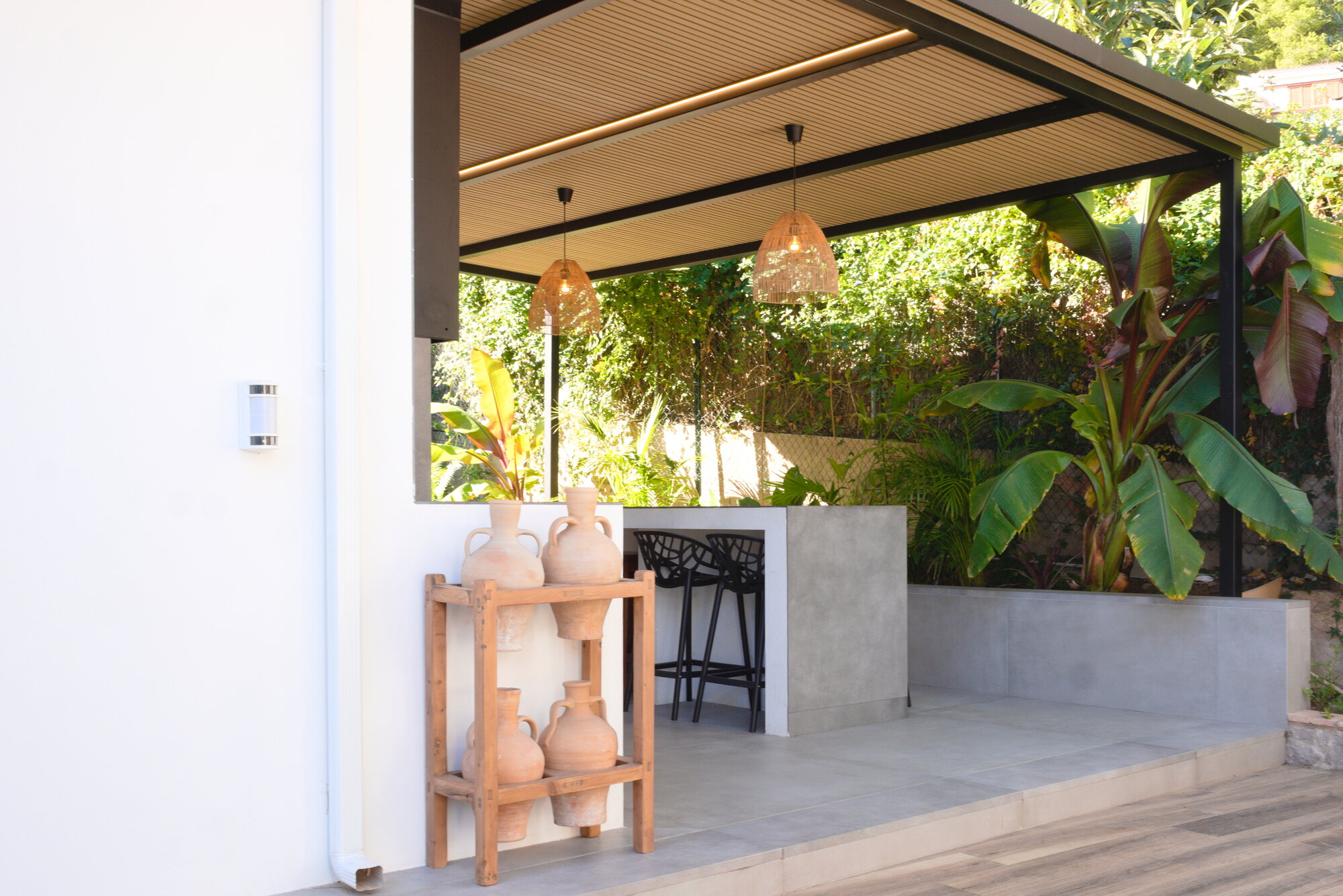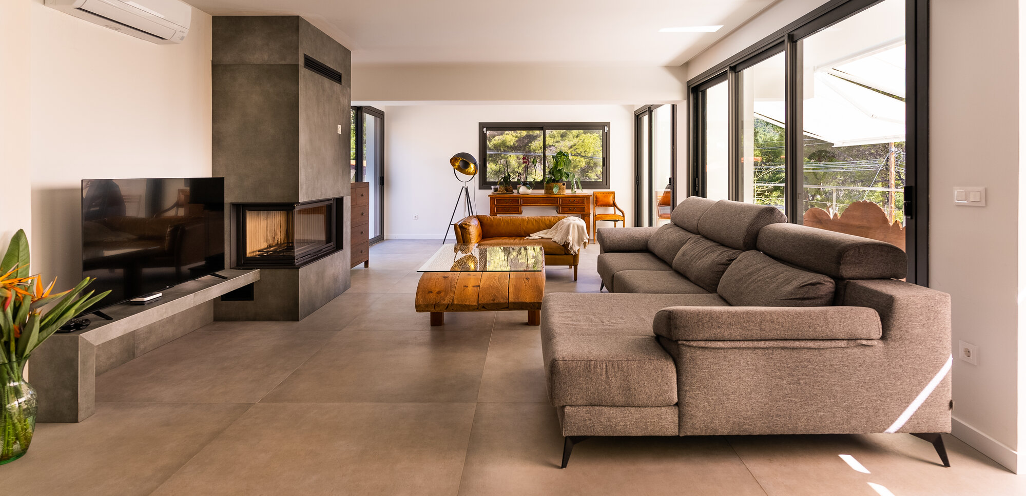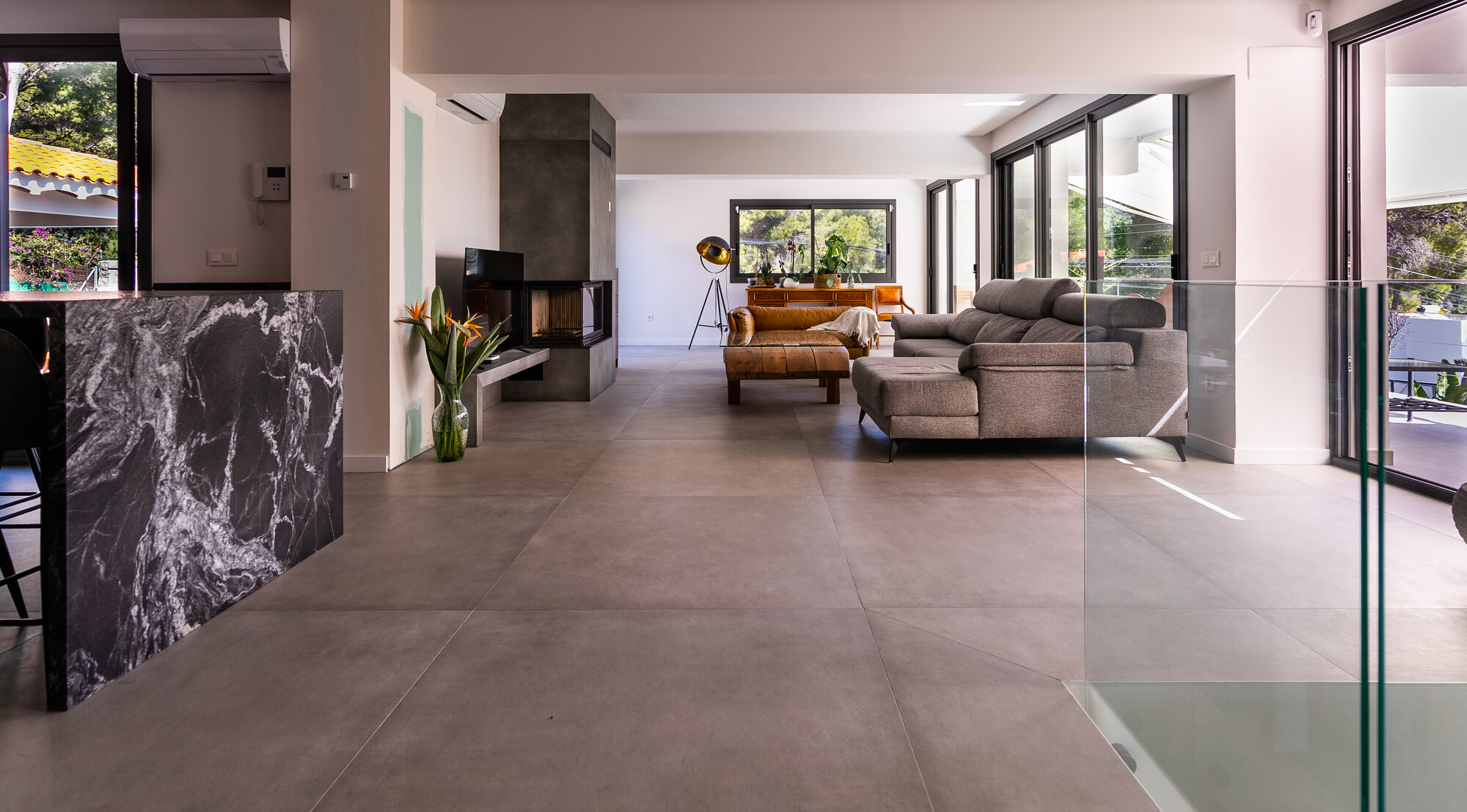 Отдельный дом площадью 370 кв. м., расположенный на участке площадью 1100 кв. м., спроектированный Espacios Gráficos, находится в горах на расстоянии всего 3 км от пляжа. В отделке интерьера и экстерьера использована плитка Work B Cenere и Koen Miele, имитирующая соответственно цемент и дерево.