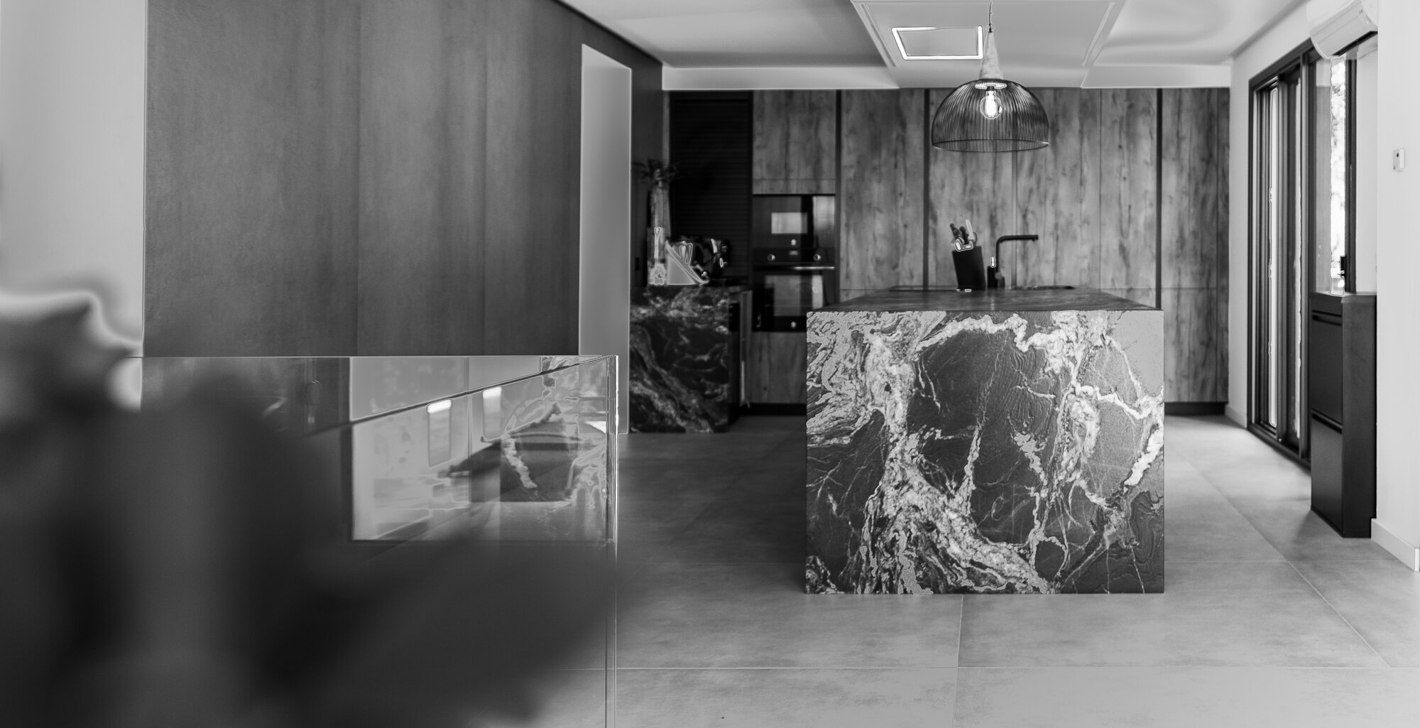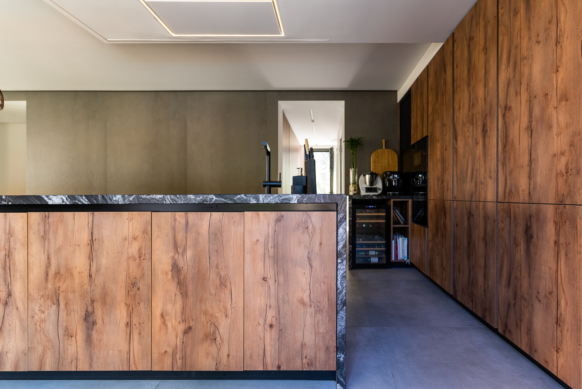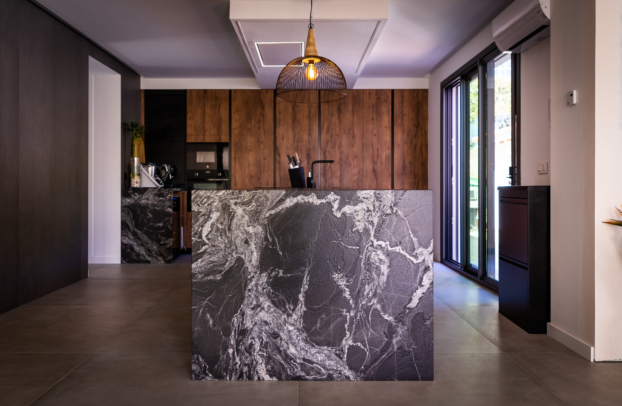 Отдельный дом площадью 370 кв. м., расположенный на участке площадью 1100 кв. м., спроектированный Espacios Gráficos, находится в горах на расстоянии всего 3 км от пляжа. В отделке интерьера и экстерьера использована плитка Work B Cenere и Koen Miele, имитирующая соответственно цемент и дерево.