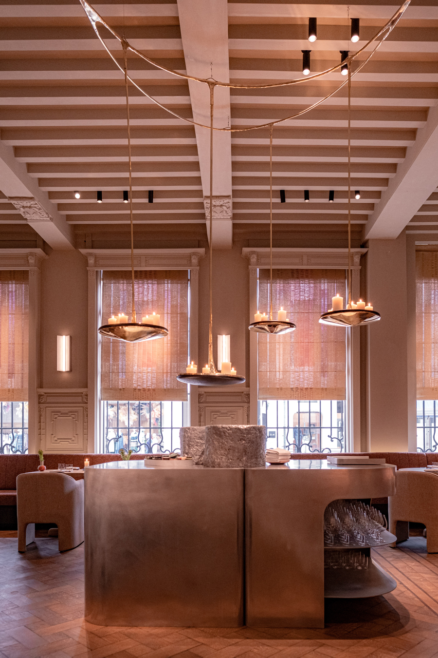 Diseñado por Space Copenhagen, el restaurante Blueness en Amberes ofrece una experiencia culinaria única donde el diseño de interiores y la historia de la arquitectura se entrelazan. La paleta de colores oscuros y materiales ricos refleja la estética japonesa, mientras que las columnas y arcos del edificio, originalmente diseñado por el arquitecto Joseph Hertogs en 1905, se mantienen intactos. «El proceso de diseño se ha visto alimentado por la historia fragmentada del edificio renacentista del siglo XVII», explican los diseñadores.