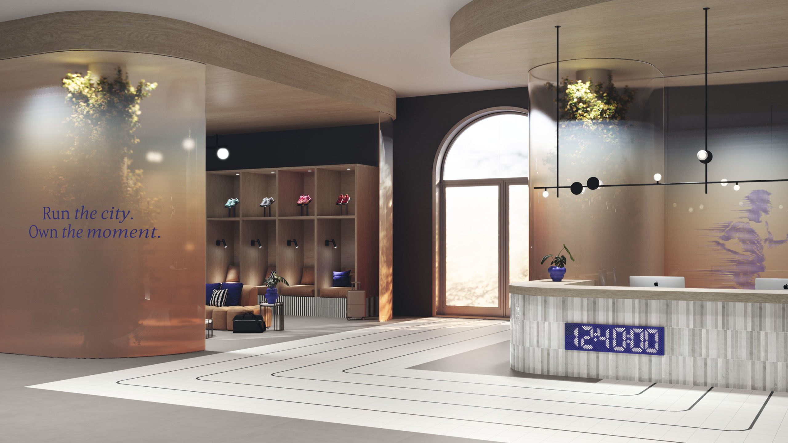 La propuesta del lobby combina esencia mediterránea con una estética contemporánea y tecnológica. Se optimiza el mobiliario, se evita el cliché decorativo y se apuesta por una paleta sofisticada y referencias visuales ligadas al running urbano.
