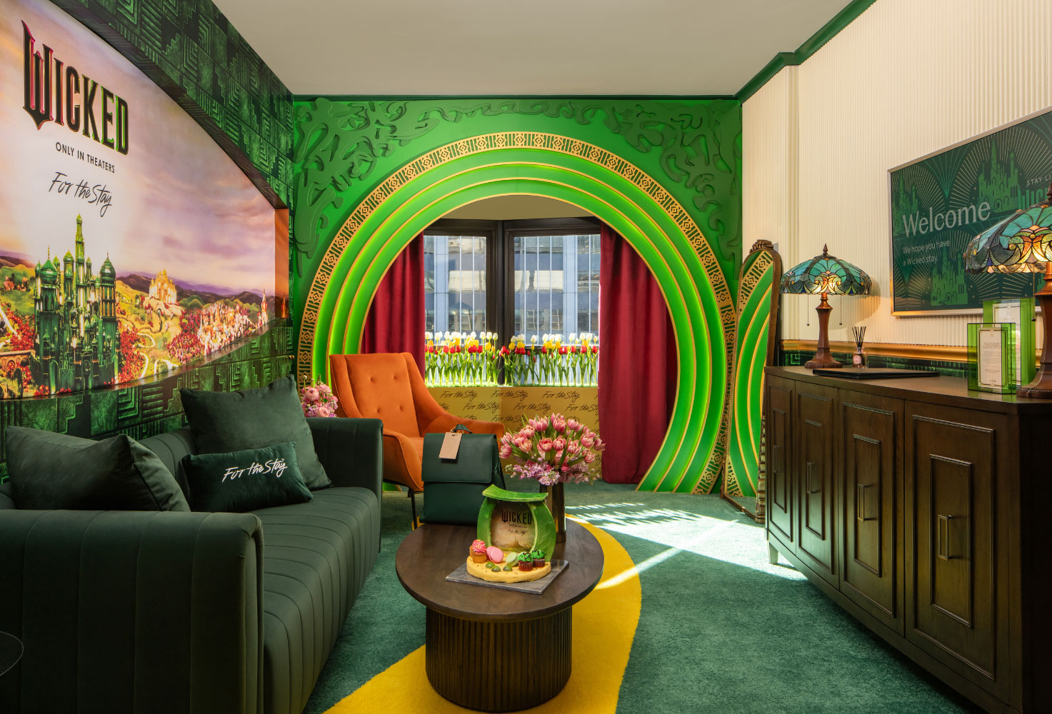 Los fans de la película Wicked pudieron sumergirse en la suite Stay Like Wicked del Hilton Midtown de Nueva York, donde, entre noviembre de 2024 y enero de 2025, el Grupo Hilton se asoció con Universal Pictures para crear un espacio inspirado en la Ciudad Esmeralda, evocando la magia del escenario Art Déco de la Tierra de Oz.