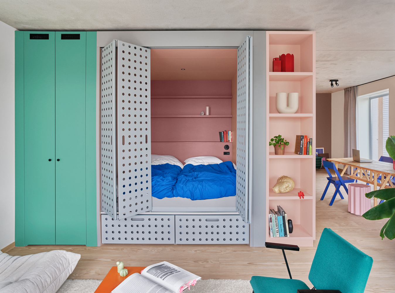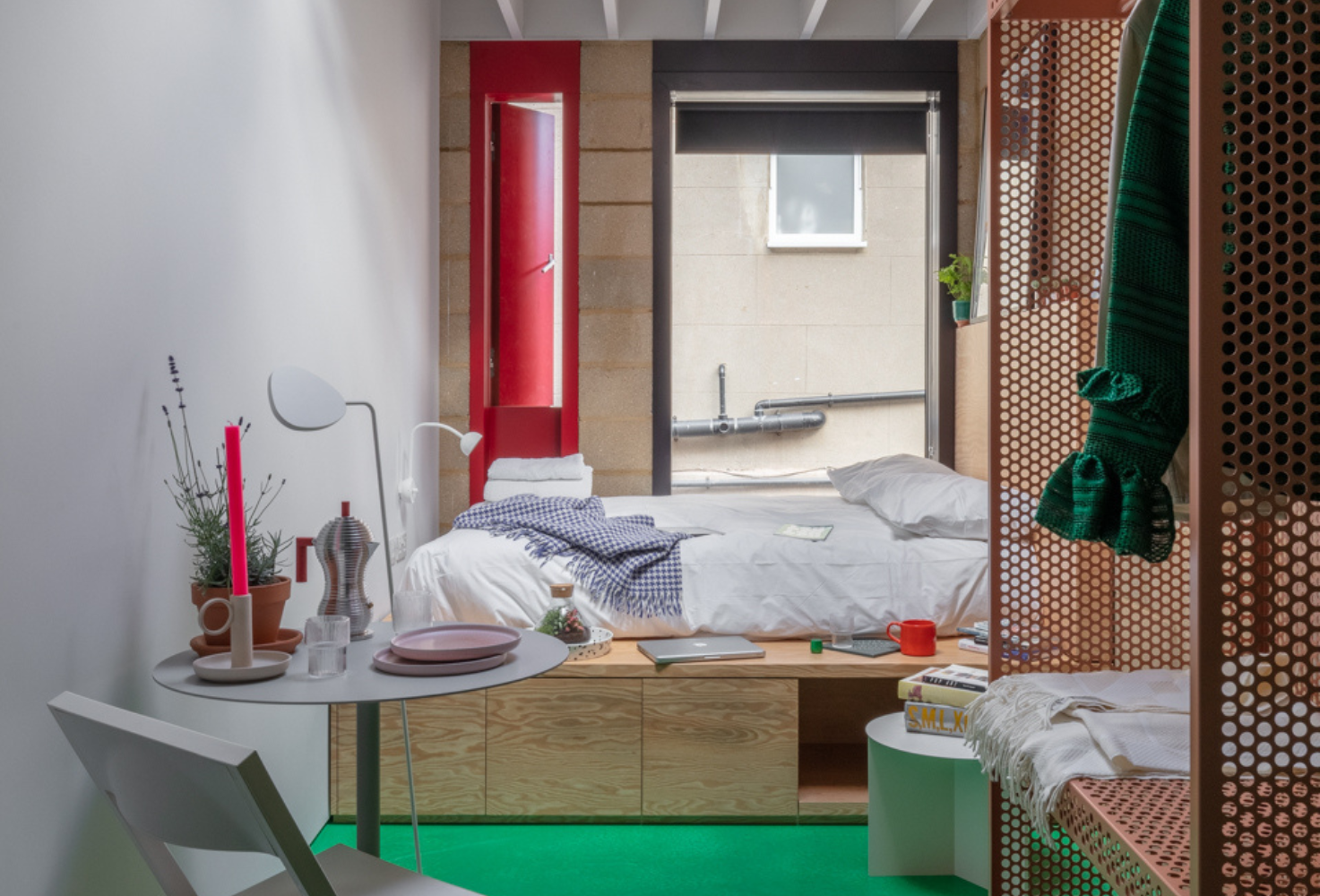 El espacio londinense de convivencia Noiascape fabrica microapartamentos a medida con muebles multiusos, como una cama de plataforma o un armario móvil, con una estética colorista y personalizada.